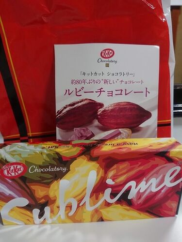 大丸梅田店キットカットショコラトリーでルビーチョコレートが買えます。約80年ぶりの新しいチョコレート♪可愛いケースと袋に入れてもらえた♥3本買うとケースにセットしてくれるみたい。 原材料・ルビーチョコレートとは書いてないのだ。パカって開ける。見…