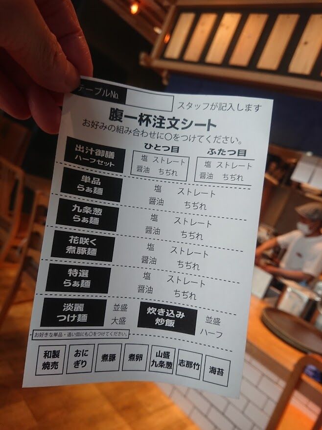 スープは塩と醤油が選べます。麺もちぢれ麺かストレート麺が選べます。