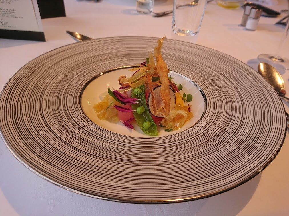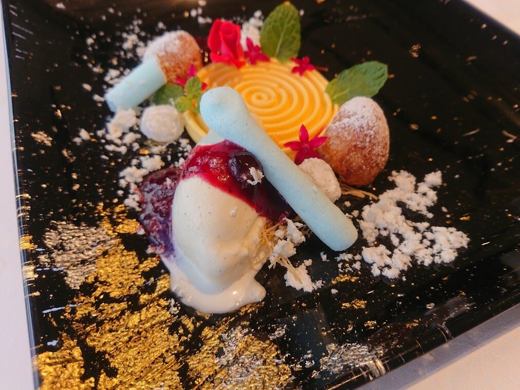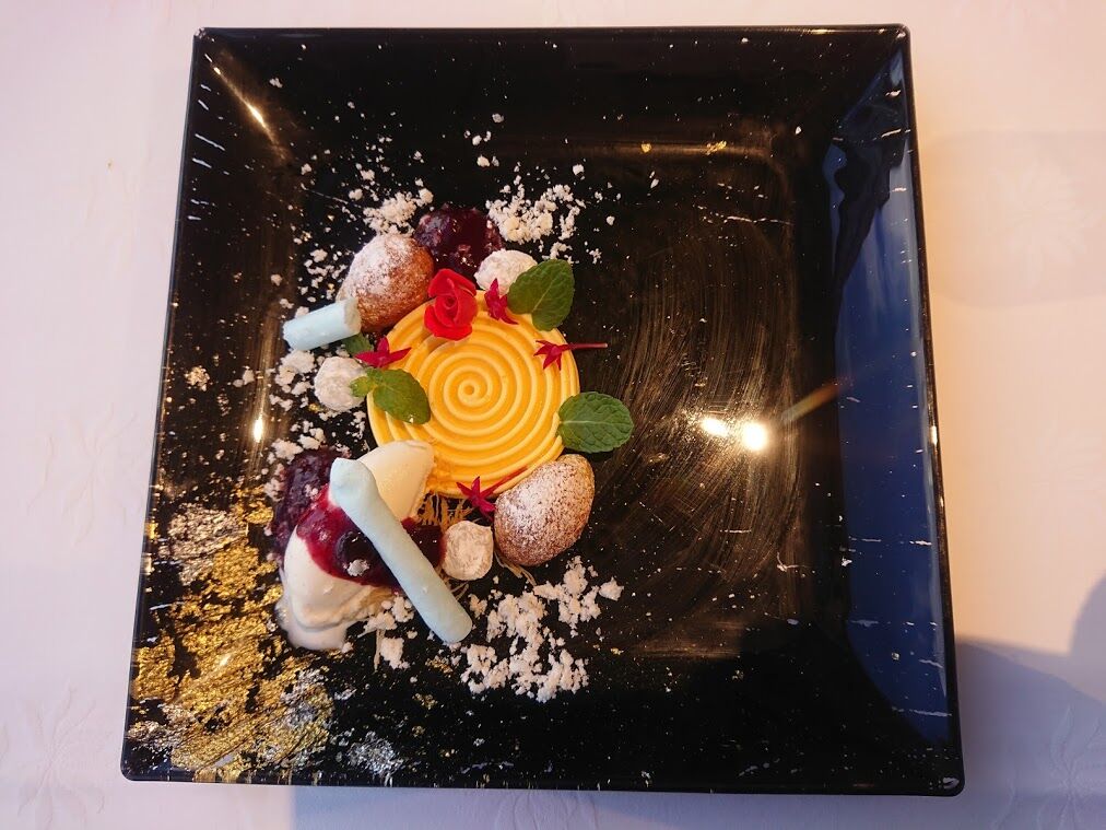 デザートはシュークリーム生地か添えられていて、真ん中の丸いのはマンゴーブランマンジュ。あえて真ん中に置かずお皿に空きを作っているのが美しい。絵画のよう。