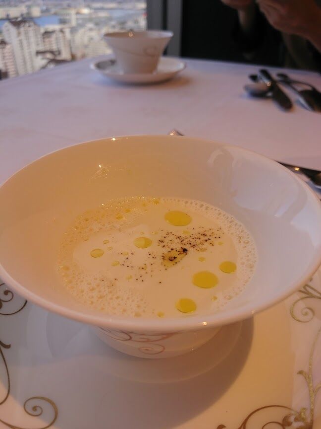 スープは黒胡椒がアクセント。カリフラワー・・・普通に食べたら淡白なのになぁ!