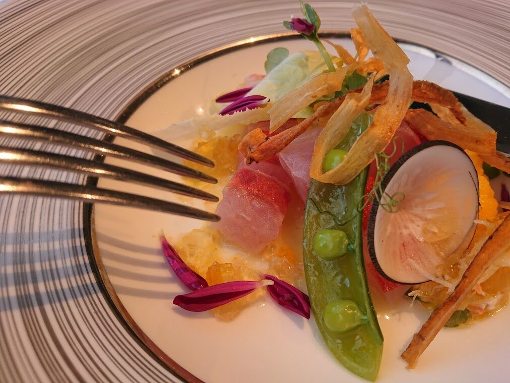 Alfonsino and ground cherry with Kasumi snow crabmeat and leek